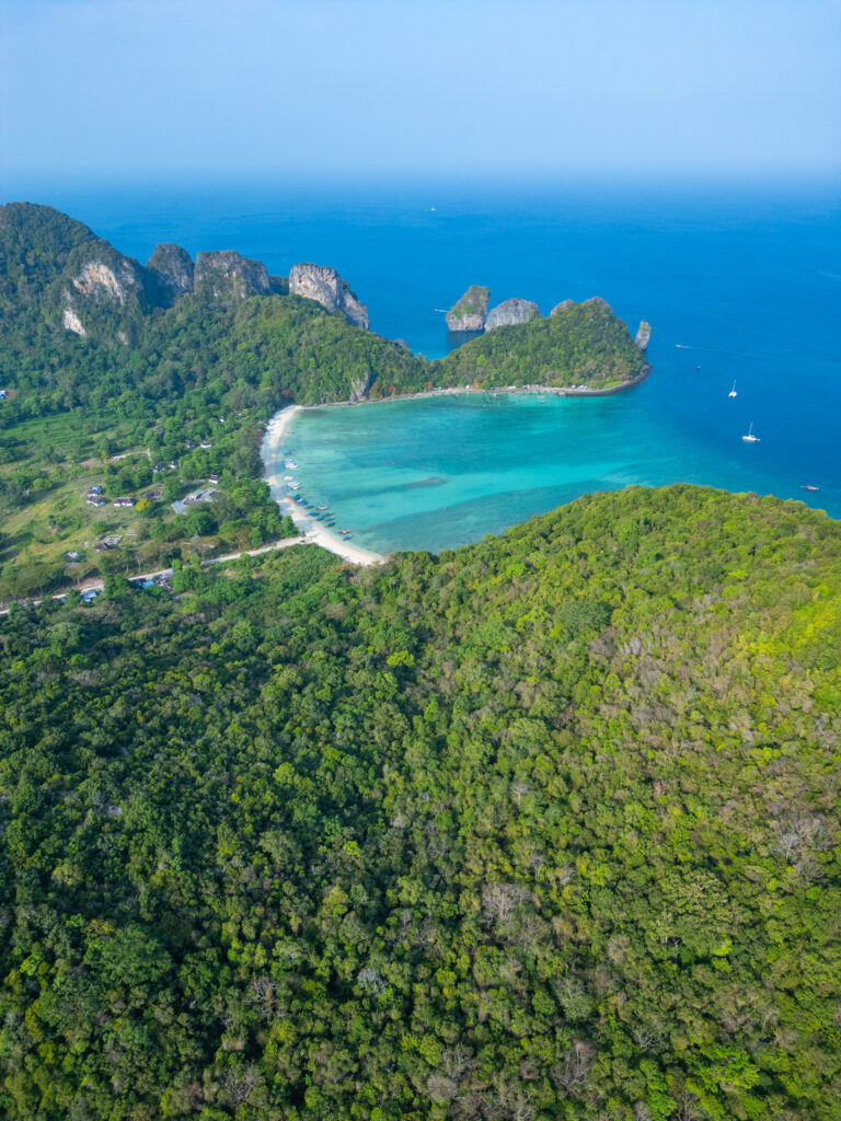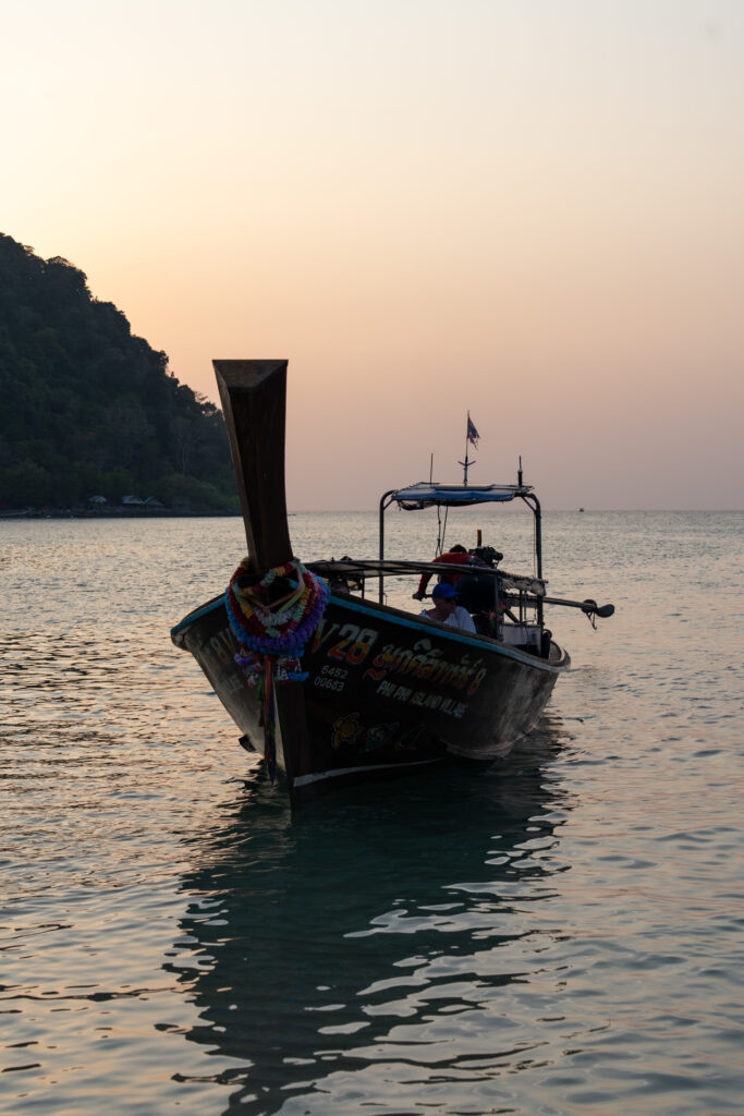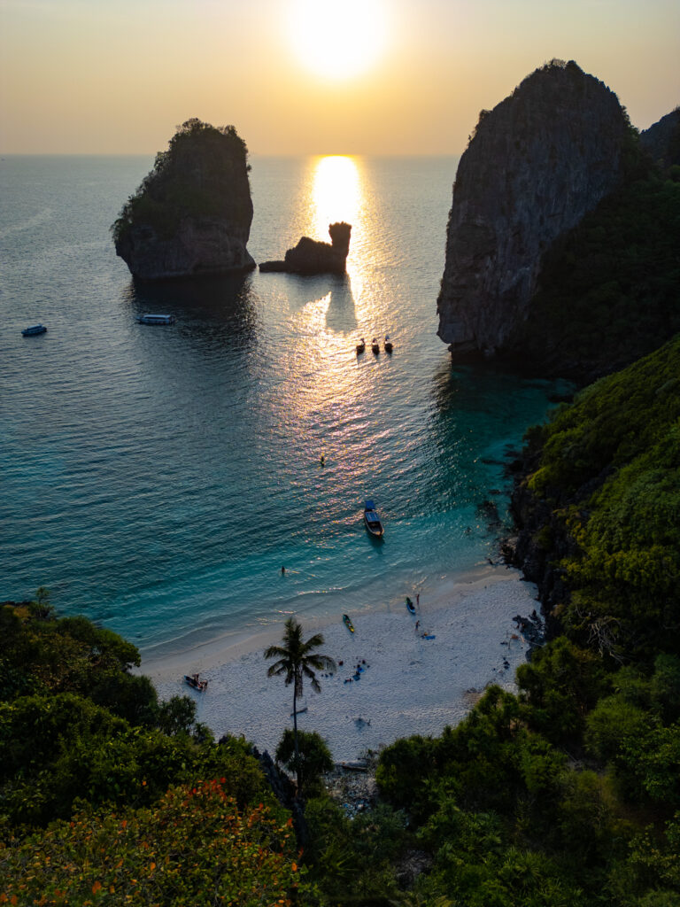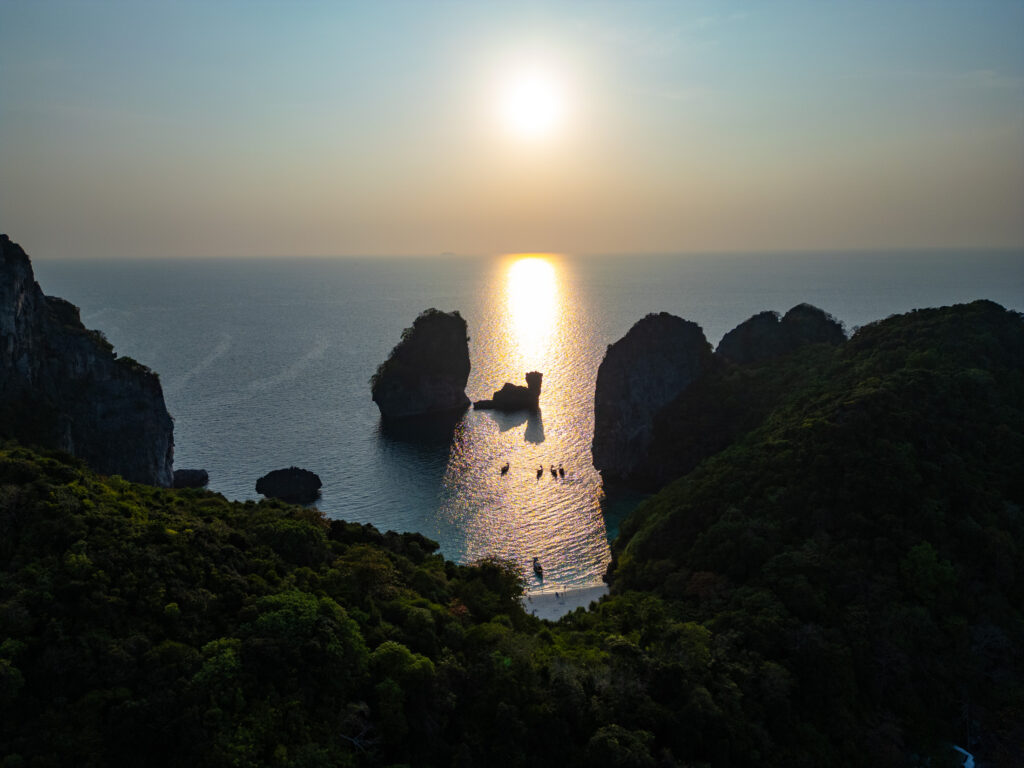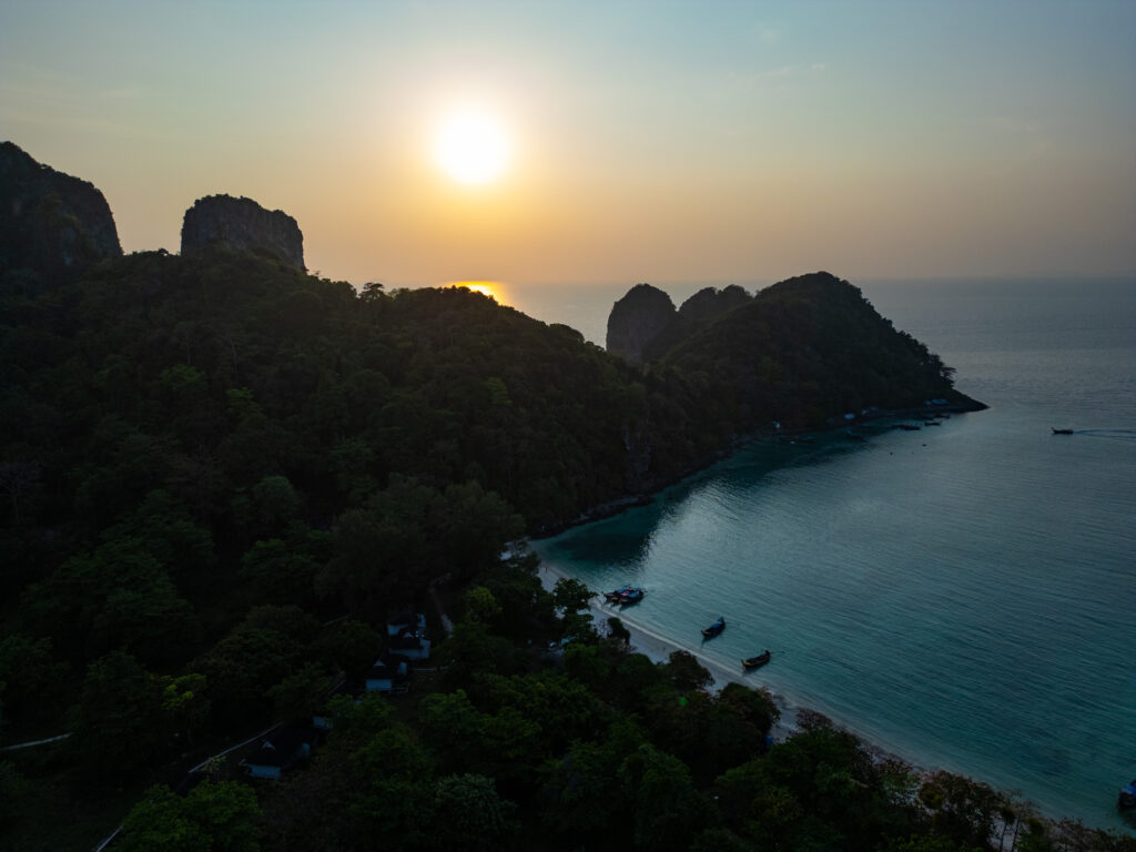 On tente quand même une incursion en ville — la “vraie” Ko Phi Phi Don — avec un taxi boat depuis l’hôtel (250 THB, prix “raisonnable” comparé au reste). Et là, retour brutal à la réalité : une ville qui a tout perdu de son charme d’antan, remplacée par des alignements de bars, restos, agences de voyage hors de prix, et shops de weed vendue quatre fois plus cher qu’à Krabi. Heureusement, la randonnée jusqu’aux Viewpoints 1, 2 et 3 rattrape un peu le coup, même si le troisième, devenu privé, semble jouer sur une forme d’arnaque un peu floue. Le coucher de soleil depuis Nui Beach, repéré en drone, offre l’un des plus beaux moments du séjour — lumière incroyable entre 17h30 et 18h. On y retourne le lendemain en taxi boat (500 THB aller-retour, pas donné mais acceptable). On termine ce séjour sur un dîner d’anniversaire les pieds dans le sable, dans un resto italien étonnamment bon, avant de craquer pour un pork belly fondant dans un resto thaï voisin. Derniers massages, dernières rêveries sous space cake (tolérance activée, effets plus doux), et on reprend le bateau direction Krabi, où notre chère voiture cabossée nous attend fidèlement.