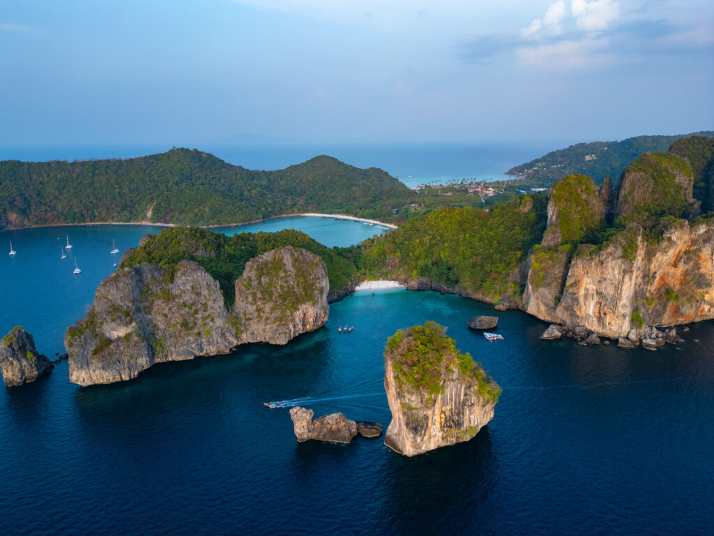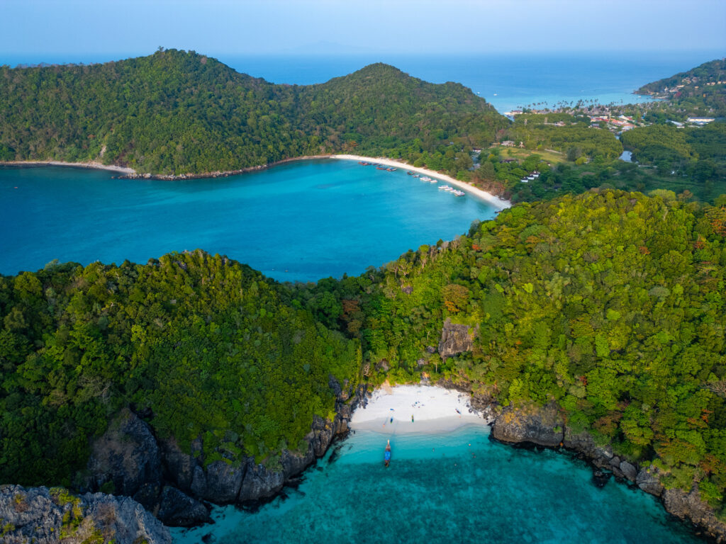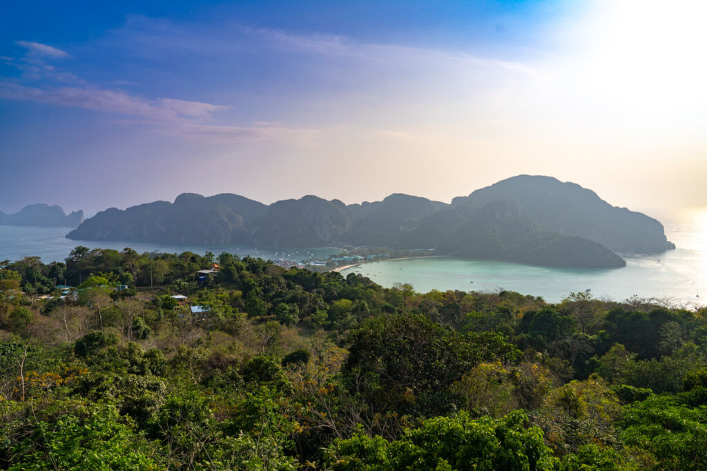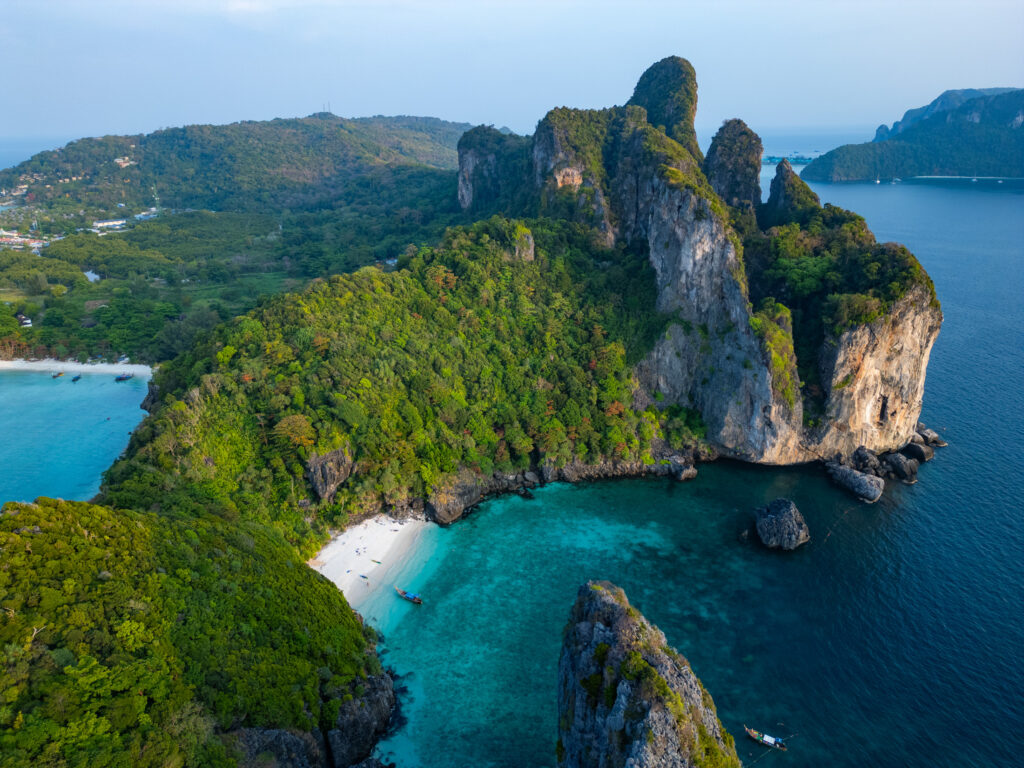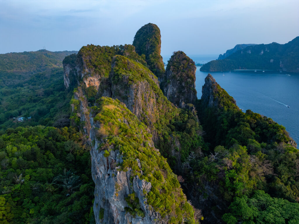 On tente quand même une incursion en ville — la “vraie” Ko Phi Phi Don — avec un taxi boat depuis l’hôtel (250 THB, prix “raisonnable” comparé au reste). Et là, retour brutal à la réalité : une ville qui a tout perdu de son charme d’antan, remplacée par des alignements de bars, restos, agences de voyage hors de prix, et shops de weed vendue quatre fois plus cher qu’à Krabi. Heureusement, la randonnée jusqu’aux Viewpoints 1, 2 et 3 rattrape un peu le coup, même si le troisième, devenu privé, semble jouer sur une forme d’arnaque un peu floue. Le coucher de soleil depuis Nui Beach, repéré en drone, offre l’un des plus beaux moments du séjour — lumière incroyable entre 17h30 et 18h. On y retourne le lendemain en taxi boat (500 THB aller-retour, pas donné mais acceptable). On termine ce séjour sur un dîner d’anniversaire les pieds dans le sable, dans un resto italien étonnamment bon, avant de craquer pour un pork belly fondant dans un resto thaï voisin. Derniers massages, dernières rêveries sous space cake (tolérance activée, effets plus doux), et on reprend le bateau direction Krabi, où notre chère voiture cabossée nous attend fidèlement.