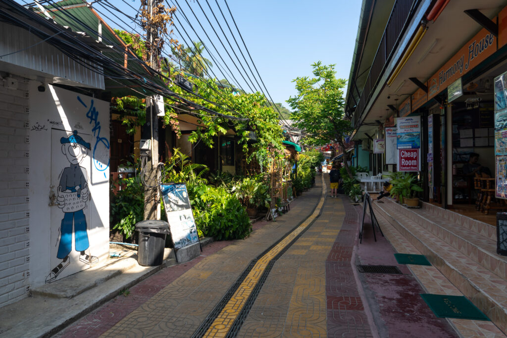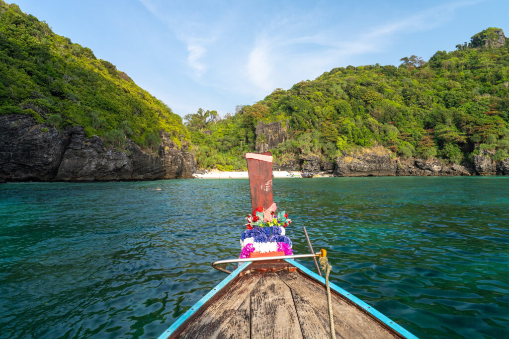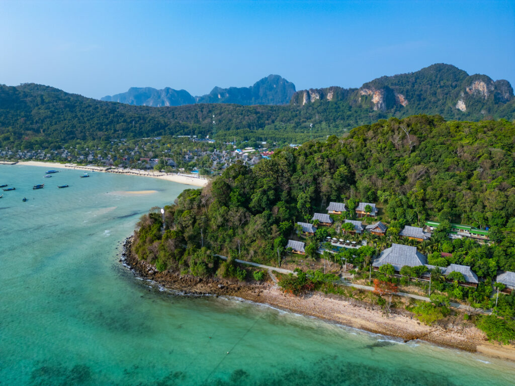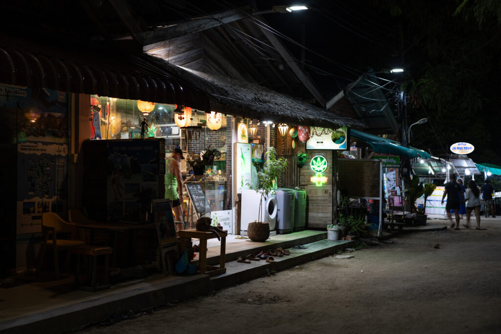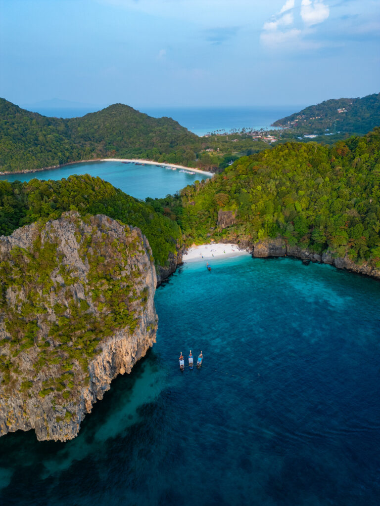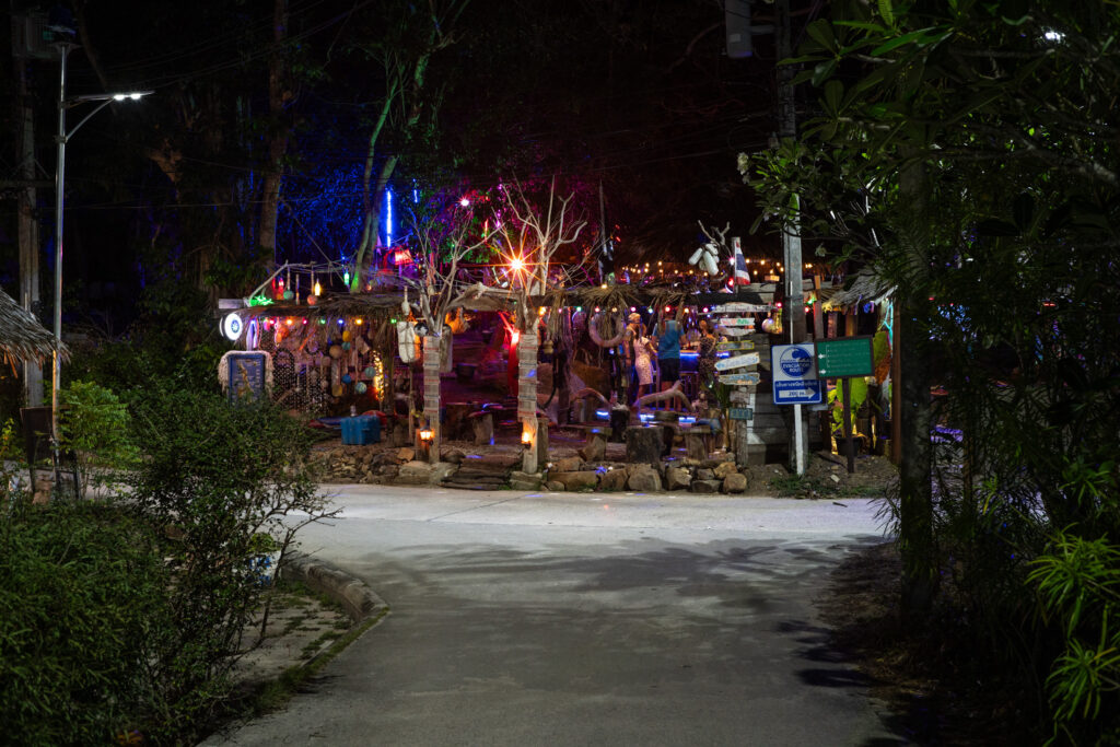 Ko Phi Phi commence comme un rêve un peu irréel. On loge à l’écart de la ville, dans un petit coin paisible à dix minutes à pied d’un village étonnamment charmant. C’est coloré, vivant sans être bruyant, avec des LEDs discrètes, des restos décorés avec goût, des bars détendus, des salons de massage accueillants, un peu de cannabis ici ou là… mais tout dans une ambiance calme et chaleureuse. On y mange un excellent Tom Kha Gai et un Panang Curry au porc chez Thaï Sea, on découvre que le porc s’accorde bien mieux que le poulet avec cette sauce. Le massage du soir au Chayamassage finit de compléter le tableau. L’ambiance ici est douce, fluide, relax. Le resort est nickel : chalets confortables, piscine impeccable, tout est bien pensé pour le farniente sans prétention. Le temps passe entre balades, baignades, photos, et jus de fruits de la passion.